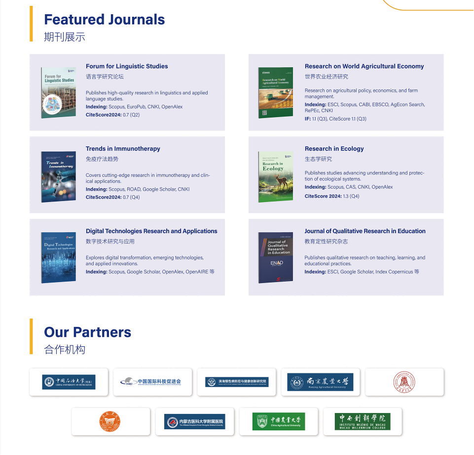 At present, the Group administers over 50 open access journals, spanning disciplines including environmental science, agriculture, engineering, medicine, linguistics, and education. It has aggregated more than 2,000 experts and over 60 academic leaders globally, with a number of its journals indexed in databases such as SCI, ESCI, and Scopus. The Group also maintains in-depth collaboration with international academic platforms like Crossref, Google Scholar, CABI, CAS, and EBSCO, so as to continuously facilitate the global dissemination of scientific research outputs.